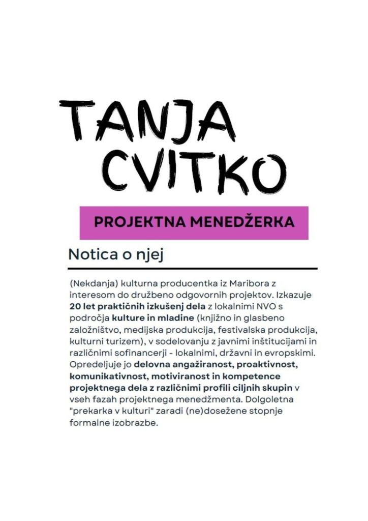 Nekoč srčno vezana s t.i. mariborskim kulturno kreativnim sektorjem. Danes v intenzivni menjavi kariernih vlakov. Med pretiranim pitjem kave se dolgo pogovarja(m) sama s sabo in si redno odpušča(m) nespametne poteze na življenjski šahovnici. V nespečnih nočeh piše(m) besedila in snuje(m) bodoče dogodivščine. Mogoče … pa res potrebuje(m) dnevnega urednika svojih predolgih tekstov.